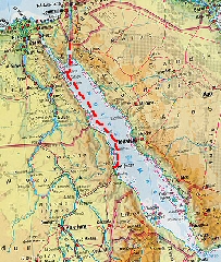 Beim Einlaufen in den Golf von Aqabah verengt sich das Meer schlagartig. Die saudische und die ägyptische Küsten sind nur wenige Kilometer voneinander entfernt. Auf beiden Seiten säumen Korallenriffe die Küstenlinien, und die Fahrrinne ist nur gerade 500 Meter breit, was eine hohe Konzentration des Kapitäns erfordert. Auf der saudischen Seite ankern nur ein paar wenige Jachten im türkisblauen Meer. Die Küste von Sharm es Sheik dagegen wird von unzähligen Motorbooten belagert. Diese Boote warten bei den Riffen, bis die Schorchler und Taucher sich wieder zum Hotel zurück fahren lassen wollen. Zum Teil warten bis zu zehn Motorboote auf engstem Raum - man kann sich ja vorstellen, wie es unter Wasser aussieht. Da sieht man wohl vor lauter Menschen die Fische nicht mehr... Wir sind froh, dieses Szenario vom Frachtschiff aus betrachten und kommentieren zu können!